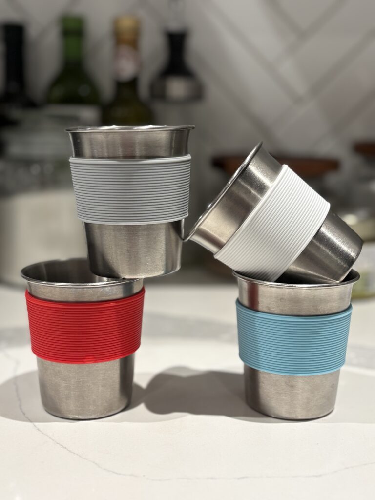 They’re the perfect size for little hands, the silicone sleeves make them easy to grip (and easy to tell whose cup is whose), and honestly — every single person who’s come over comments on them and asks where we got them.